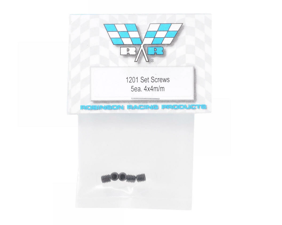 This is a pack of five Robinson Racing 4x4mm Set Screws. These are used with Robinson pinions that have a 5mm bore, but can be used in any application that requires a 4x4mm set screw.