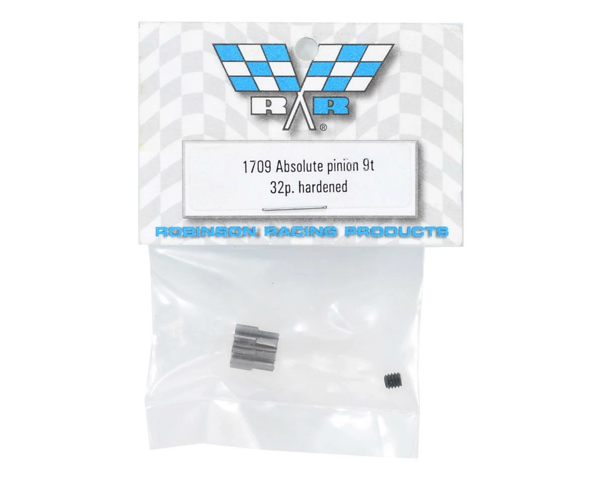 Robinson Racing Absolute 32 Pitch Hardened Pinion Gears are built to last, and are best suited for use with Robinson steel spur gears. They feature an 1/8 inch bore, a 32 pitch tooth profile, with the tooth number stamped on the side for easy identification. Choose from multiple options to fine tune the gear ratio of your vehicle. Package includes one gear and one 5-40 set screw.Â