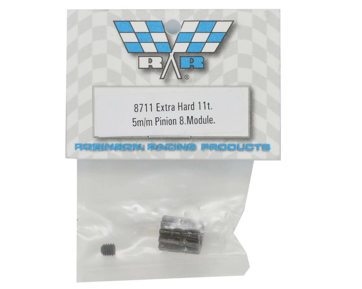 Robinson Racing Extra Hard Steel 5mm Bore .8 Mod Pinion Gears fit brushless motors with a 5mm shaft and are intended for use with the Traxxas E-Maxx model #3905. These will also work with standard size brushless motors when used with the RRP1200 reducer sleeve, making them an excellent choice for the Traxxas Slash 4×4.