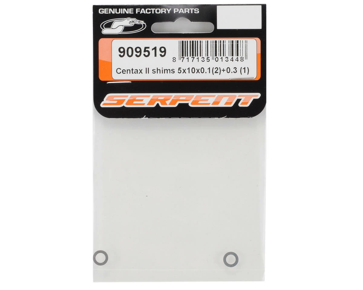 This is a replacement Serpent 5x10mm Centax-2 Clutch Shim Set, and is intended for use with the Serpent 733 1/10 vehicles, as well as 960, 966 and S811 Cobra 1/8 vehicles. This set includes two 0.1, and one 0.3 shims.Â