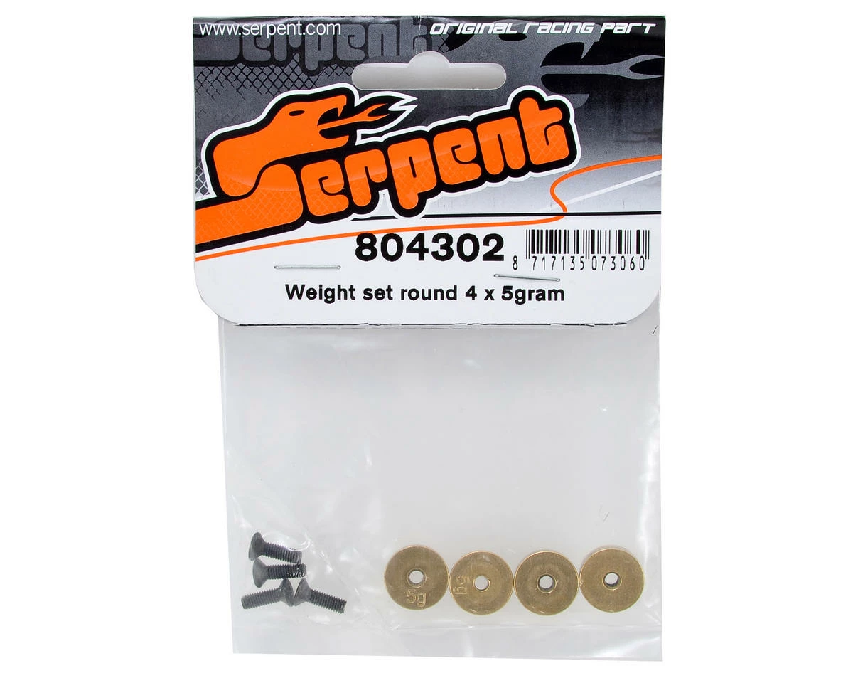 This is an optional Serpent Brass Round Chassis Weight Set. Package includes four 5g weights, and mounting hardware.Â