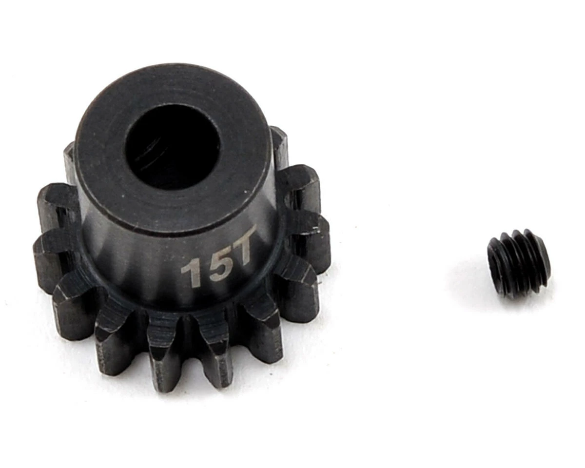 Team Associated 5mm Bore Mod1 Pinion Gear. This pinion gear features a 5mm bore and mod 1 pitch gears. This gear is recommended for the Team Associated RC8.2e 1/8 Scale buggy and any Team Associated 1/8 scale vehicle equipped with the Team Associated e-Conversion Kit. Choose from 12 through 21 tooth options. Package includes one pinion gear and one set screw.