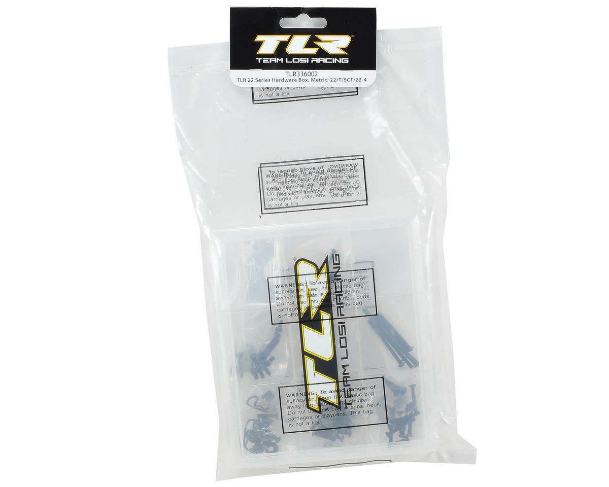 This is the TLR 22 Series Metric Hardware Box. Ever lose a small screw, and had trouble finding a replacement? Was the shop low, or out of stock on the hard to find screws for a 22 vehicle. Fear no more, pick up one of the TLR 22 Series Hardware Boxes and gain the confidence of having a space for every screw and hardware piece you might need. Check out the impressive list of hardware included below.