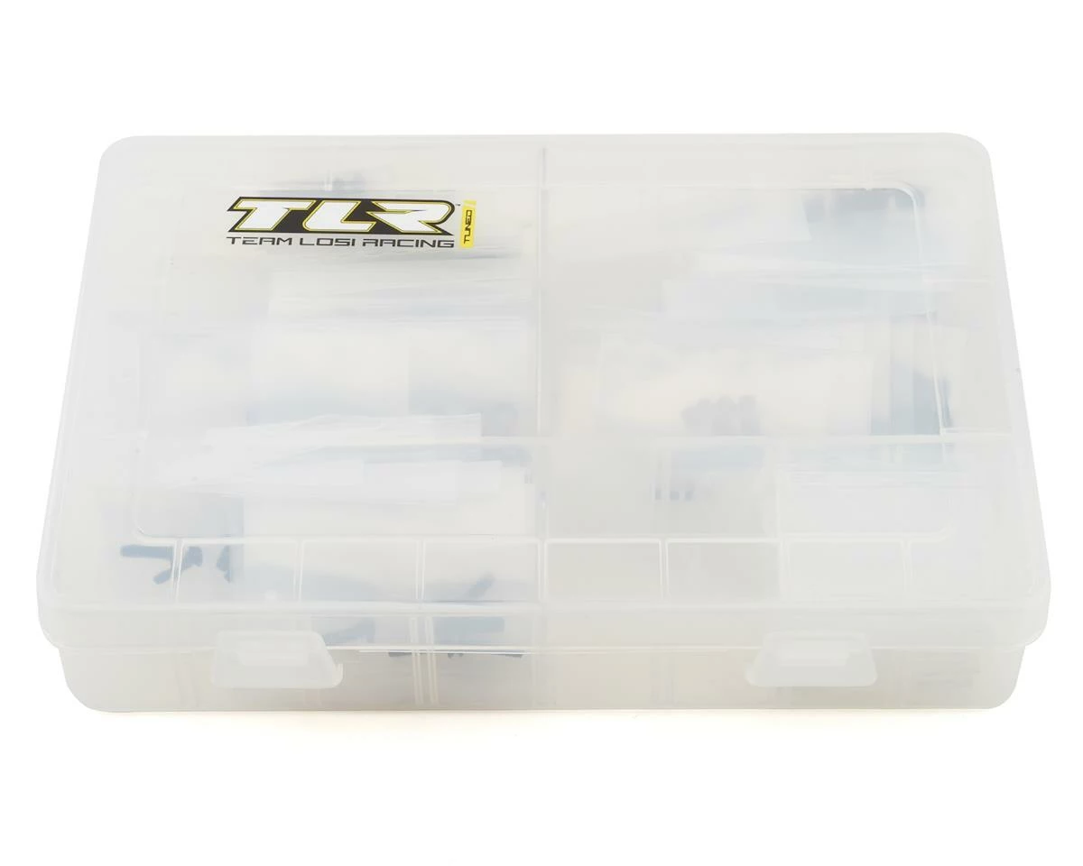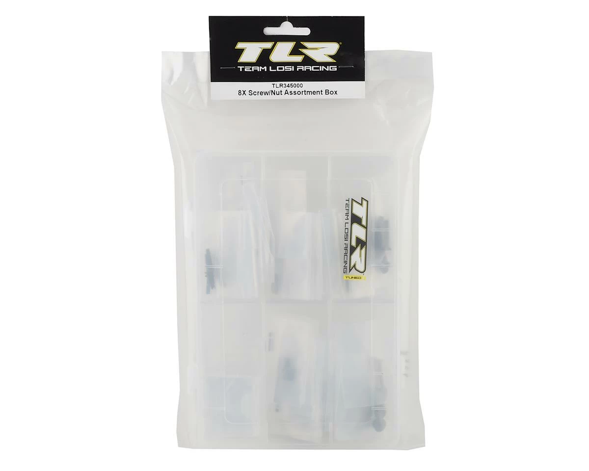 This is a Team Losi Racing Screw & Nut Assortment Box, intended for use with the Team Losi Racing 8IGHT-XE Race 1/8 Electric Buggy as an optional set of screws and nuts.